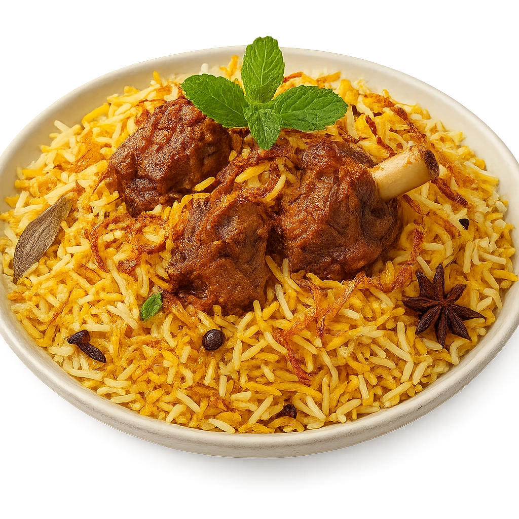 Aromatic basmati rice cooked with tender goat meat and fragrant spices for a flavorful feast.