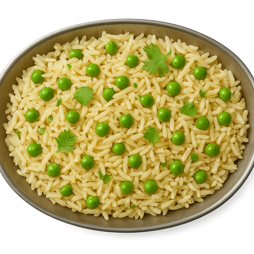 Fragrant basmati rice cooked with green peas and aromatic spices for a flavorful, comforting meal.