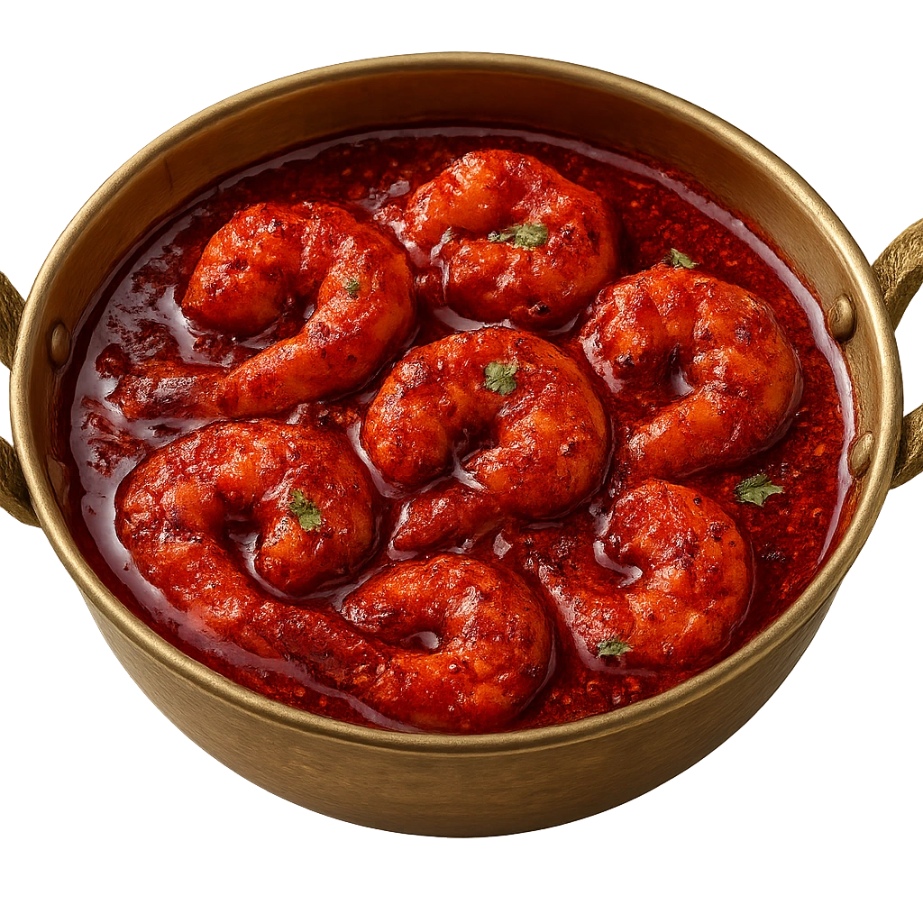 Spicy Goan-style pickled prawns cooked in tangy, fiery red chili and vinegar masala.